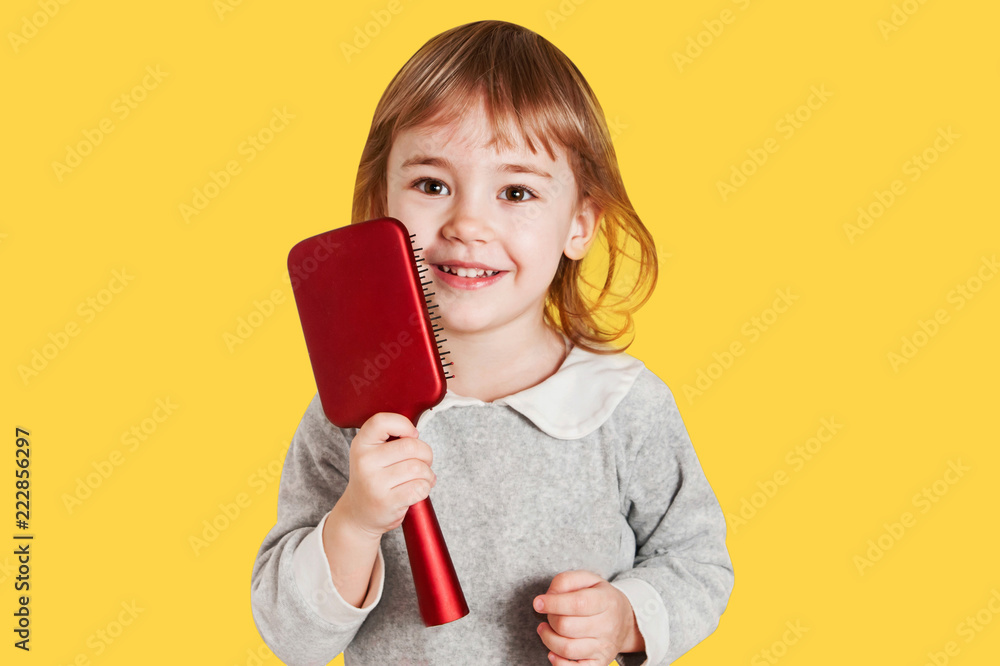 Portrait of smiling little baby girl holding comb isolated on an orange background.