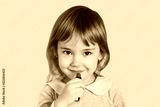 Portrait of smiling little baby girl paints lips with lipstick isolated on a beige background.
