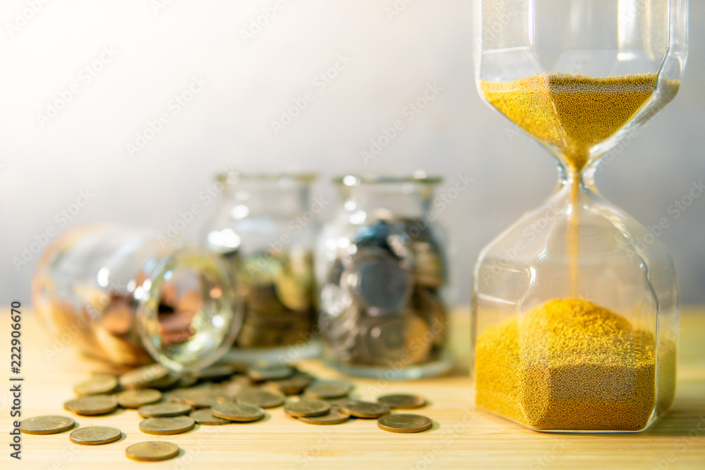 Sand running through the shape of hourglass with coins in currency glass jars on wooden table. Saving money for future retirement. Time investment concept