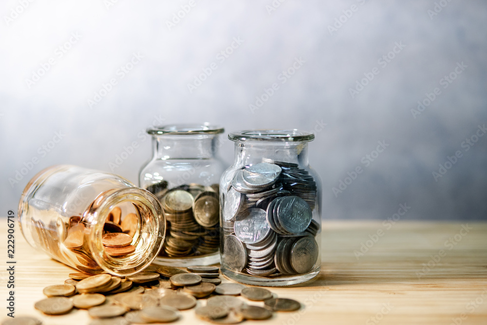 Coins in currency glass jars and spilling on wooden table. Saving money for future retirement. Financial business investment concept