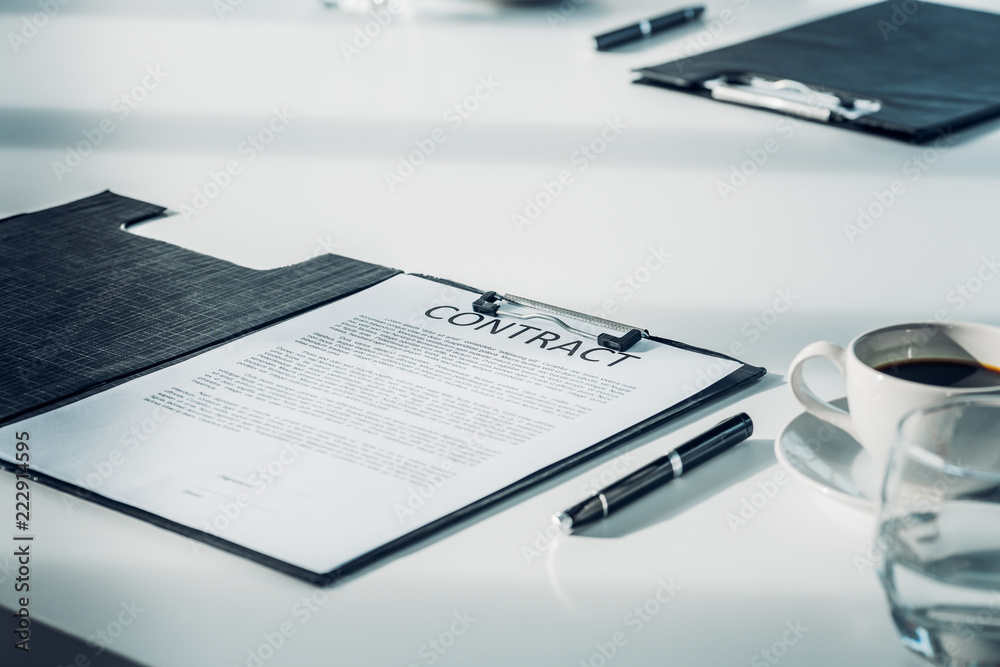 Close up business contract paper on meeting room table with pen and coffee cup in sun light shadow with green plant at office,business agreement concept.