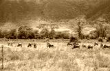 Landscape of Ngorongoro crater - herd of zebra and wildebeests (also known as gnus) grazing on grassland - wild animals at sunset - Ngorongoro Conservation Area, Tanzania, Africa