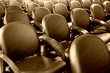 Black modern seats armchairs in conference room. Interior of conference or business hall