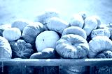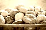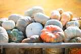 Big pile of pumpkins on hay in a wooden cart the season of harvest. Happy Thanksgiving Day. Harvest festival.