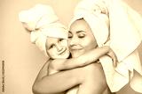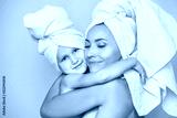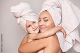 Woman young adult with daughter after shower in fresh towels hugging on isolated background