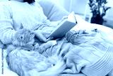 hygge, literature and people concept - red tabby cat and female owner reading book in bed at home