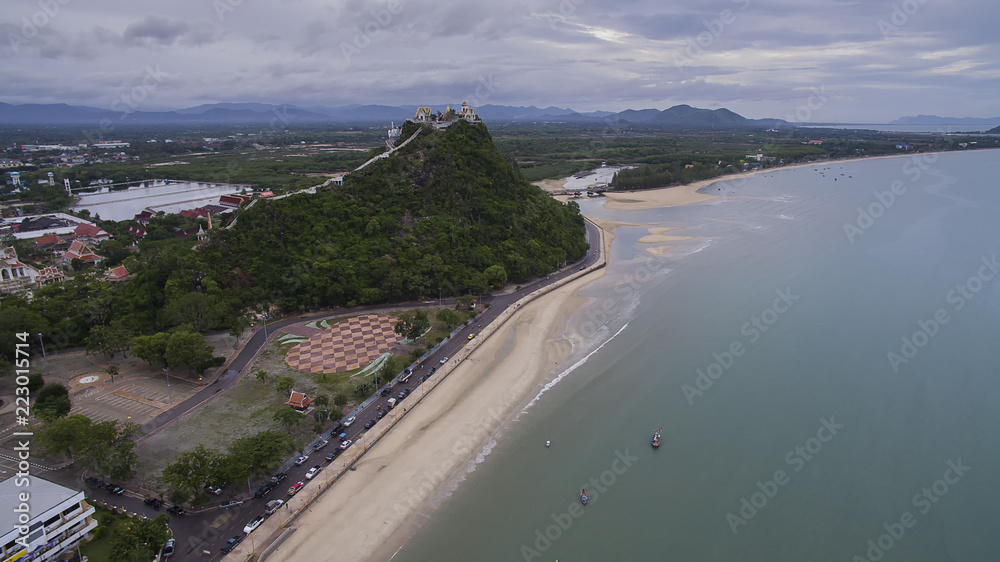 high angle view of khao takieb temple and sea coast of prachuap khiri khan harbor southern of thailand