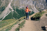 Happy woman with a backpack, hiking with trekking poles in mountain . Hiking around Mont Blanc