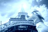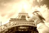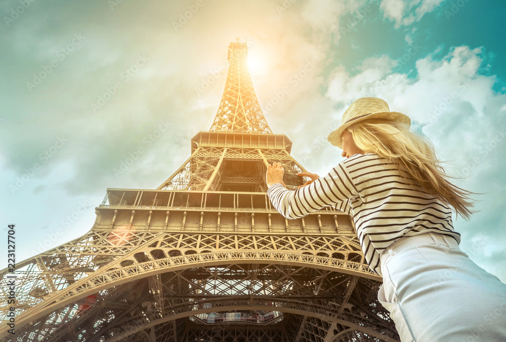 Woman tourist selfie near the Eiffel Tower in Paris under sunlight