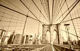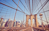 Brooklyn Bridge at sunrise, vintage stylized picture, New York City, USA.