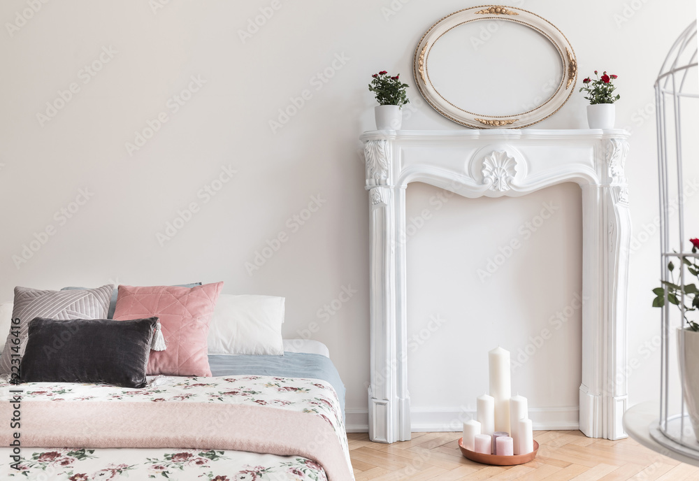 An English style bedroom interior with pastel pillows and rose pattern cover on the bed. White ornamented fireplace portal beside the bed. Copy space wall. Real photo.