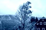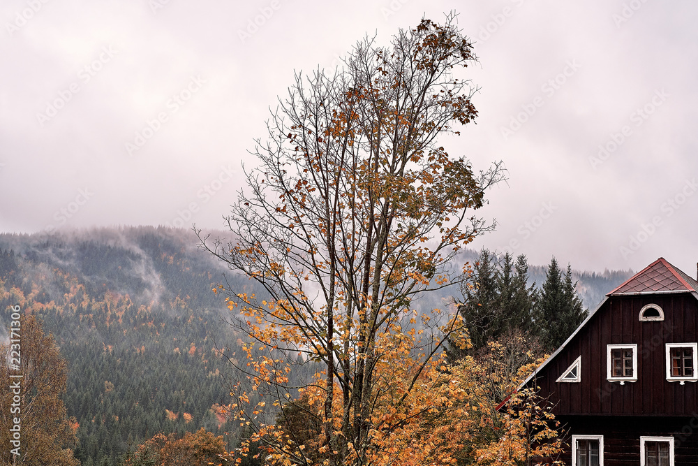 Fog and mist over the pine mountain forest with traditional old village house and a faded tree in autumn.