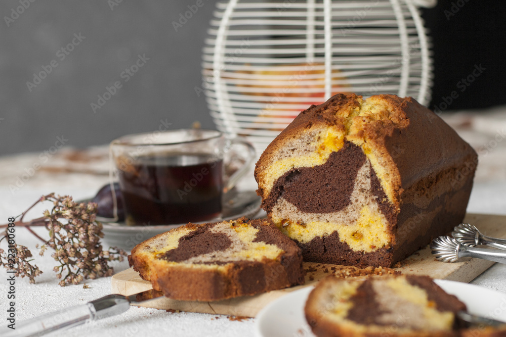Homemade marble plum cake, three colours made with saffron, walnuts and chocolate.