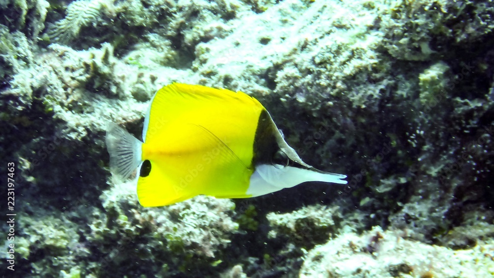Longnose butterflyfish (Forcipiger longirostris) underwater in Maldives.