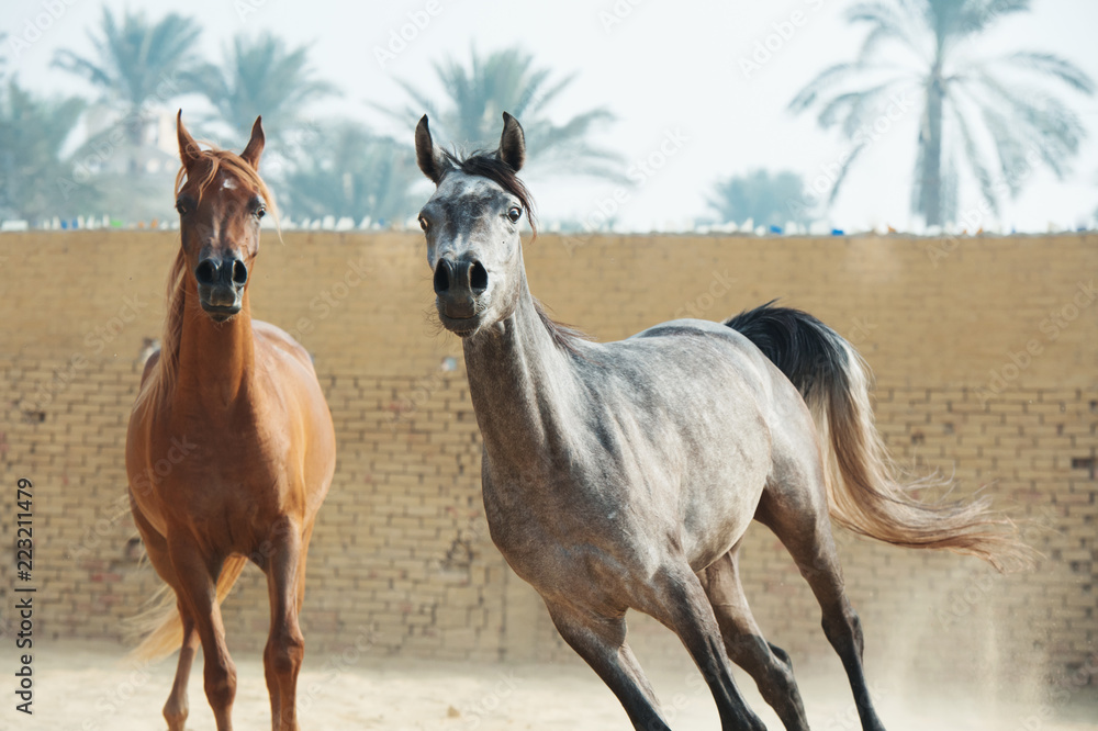 running arabian horses in the paddock