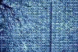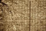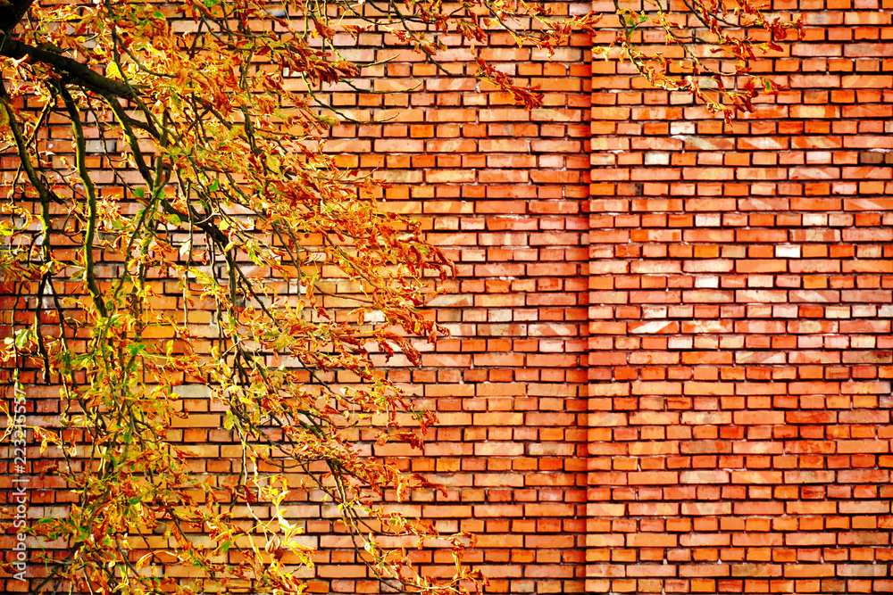 red brown brick wall of building with branch of autumn or fall season tree leaves natural background