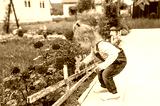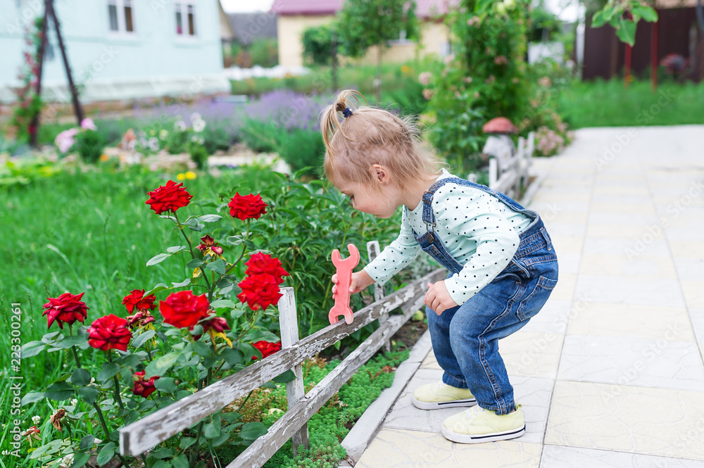 The little girl repairs a wooden fence in the yard