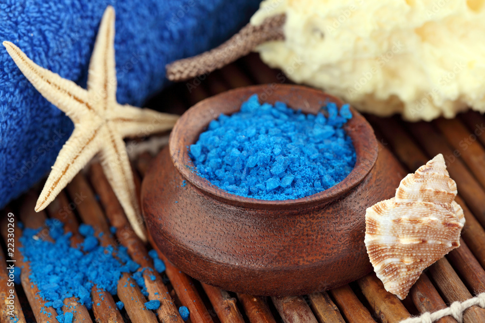Blue spa with sea salt, towel and seastar