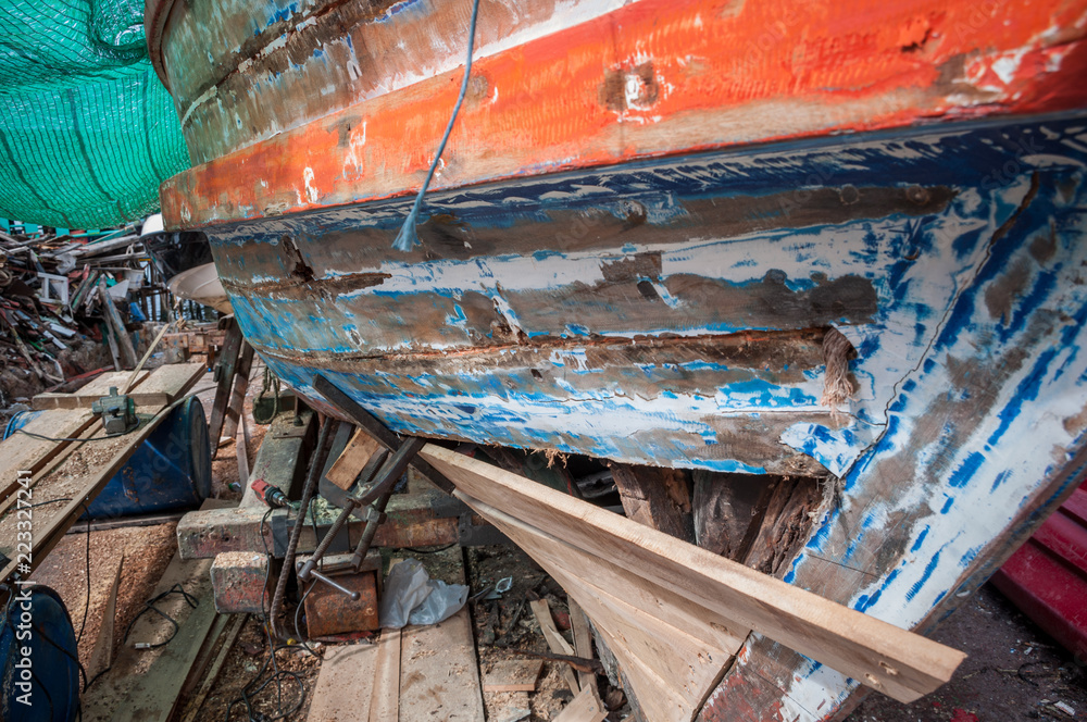 Old wood boat maintenance on beach fishery traditional Thailand bay
