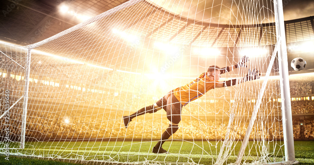 Intense soccer moment in front of the goal on the professional soccer stadium.