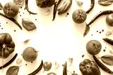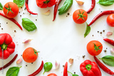 Colorful pizza ingredients pattern made of tomatoes, pepper, chili, garlic and basil on white background. Cooking concept. Top view. Flat lay. Copy space