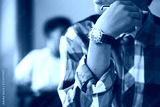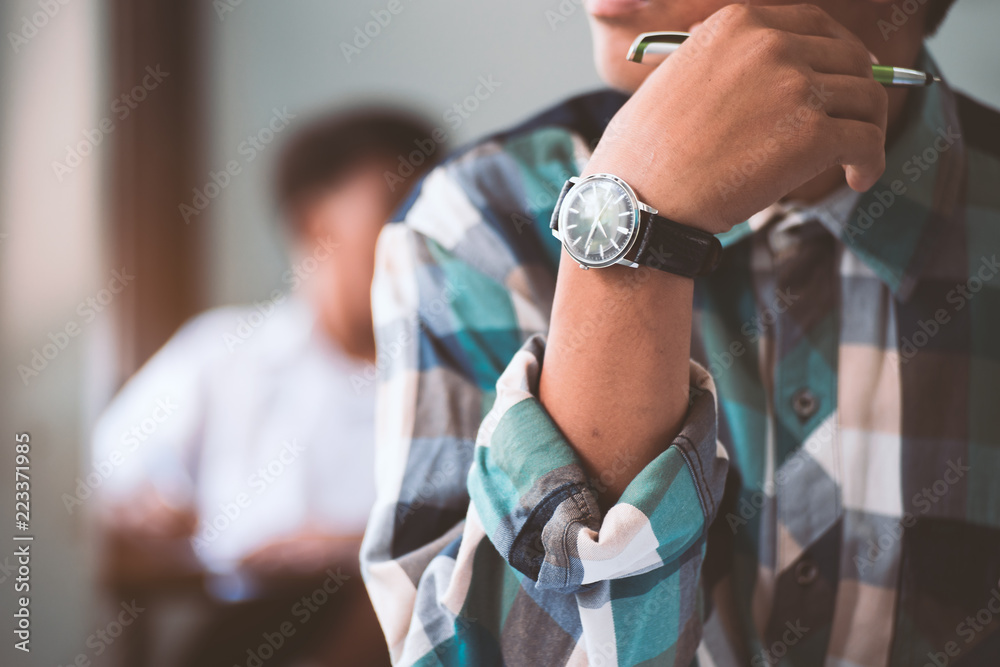 Students thinking and looking exam answer sheets exercises in classroom of school with stress.