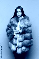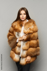 Fashionable and stylish brunette model girl with perfect makeup and blue-grey eyes, in half-length fur coat ginger colour, smiling and posing at studio, isolated