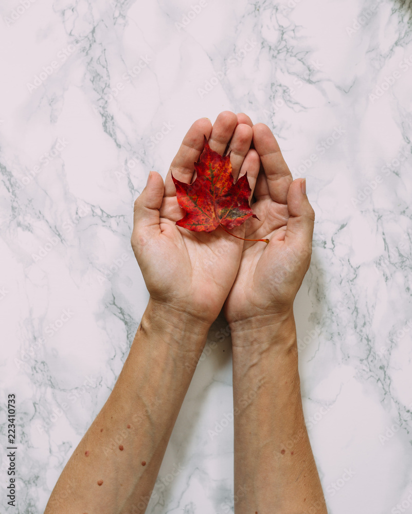Woman Hand Holding Red Maple Leaf on white marble background. Autumn concept