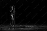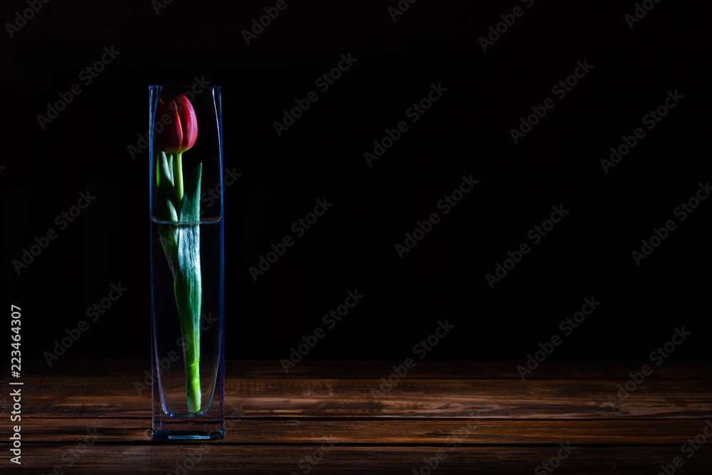 Red tulip in a vase on wooden table and black background with copy space