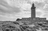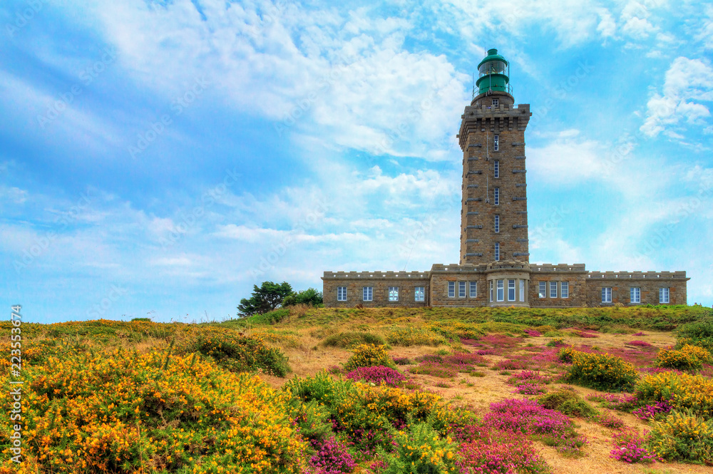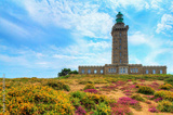 Beautiful summer view of the lighthouses at Cap Fréhel in Brittany, France, with vibrant heather flowers (Calluna vulgaris) and common gorse (Ulex europaeus)