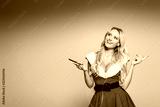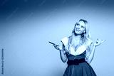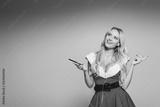 dreamy santa girl in christmas dress listening music in earphones with smartphone isolated on grey background