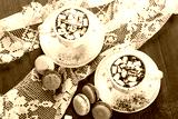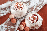 The concept of a cold winter morning. A pair of delicious cocoa drink with marshmallows in a Cup on a wooden table, top view. Hot coffee drink with marshmallows and sweets, top view.
