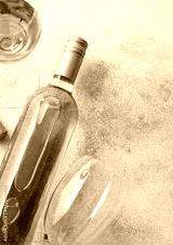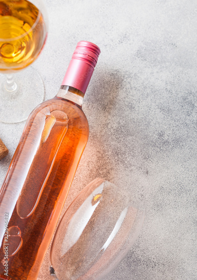 Bottle and glasses of pink rose wine with cork and corkscrew opener on stone kitchen table background. Top view.