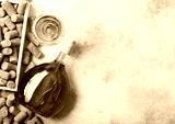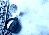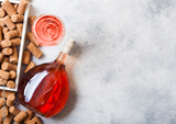 Bottle and glasses of pink rose wine with box of corks on stone kitchen table background. Top view. Space for text