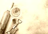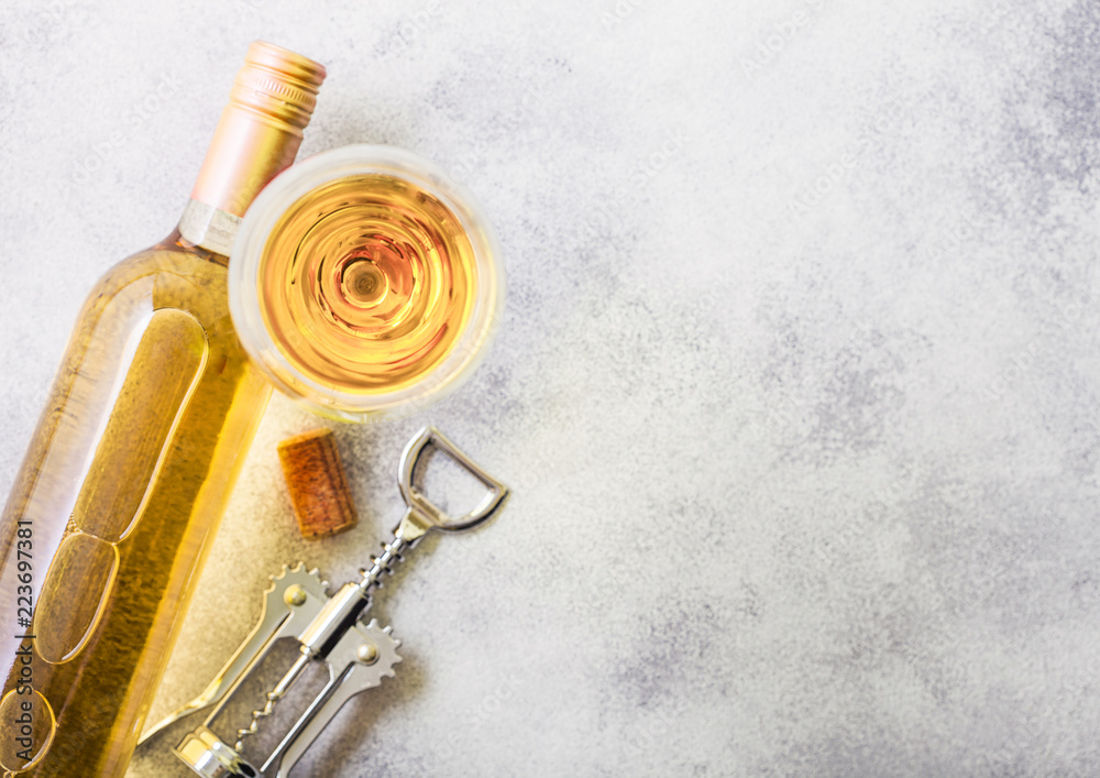 Bottle and glasses of white wine with cork and crkscrew opener on stone kitchen table background. Top view. Space for text
