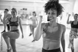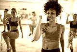 Female instructor with headset in fitness class
