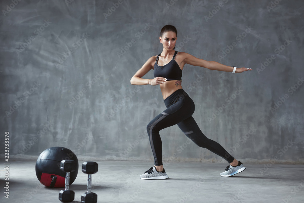 Exercise. Sports Woman In Fashion Sportswear Stretching Legs