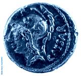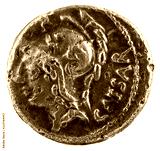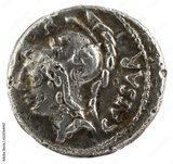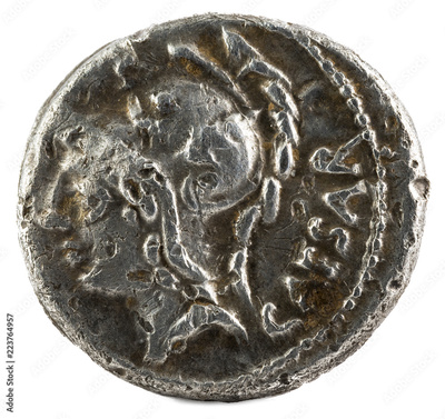 Roman Republic Coin. Ancient Roman silver denarius of the family Julia. Julius Caesar. Obverse.