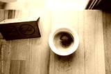 Close up, top view of strong coffee, espresso at cafe shop on wooden background with no smoking sign