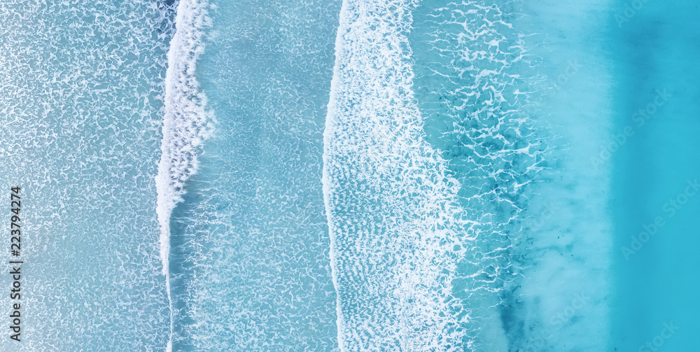 Beach and waves from top view. Turquoise water background from top view. Summer seascape from air. Top view from drone. Travel concept and idea