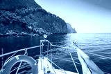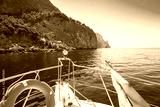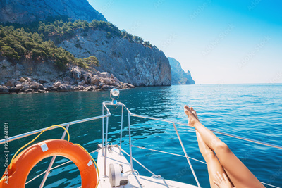 Long legs of a young woman on a yacht in the open sea having a rest start to travel with pleasure relax summer holidays concept.