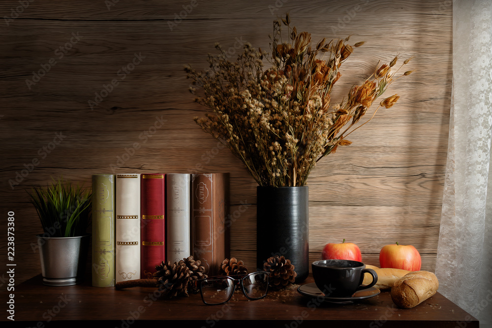 Still life of breakfast set of tea and bread and apple on wooden table with old stlye eye glasses and book and a vase of dry flowers