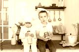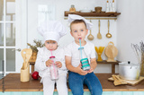 Little brother and little sister in cook cap drinking fresh juice with straw