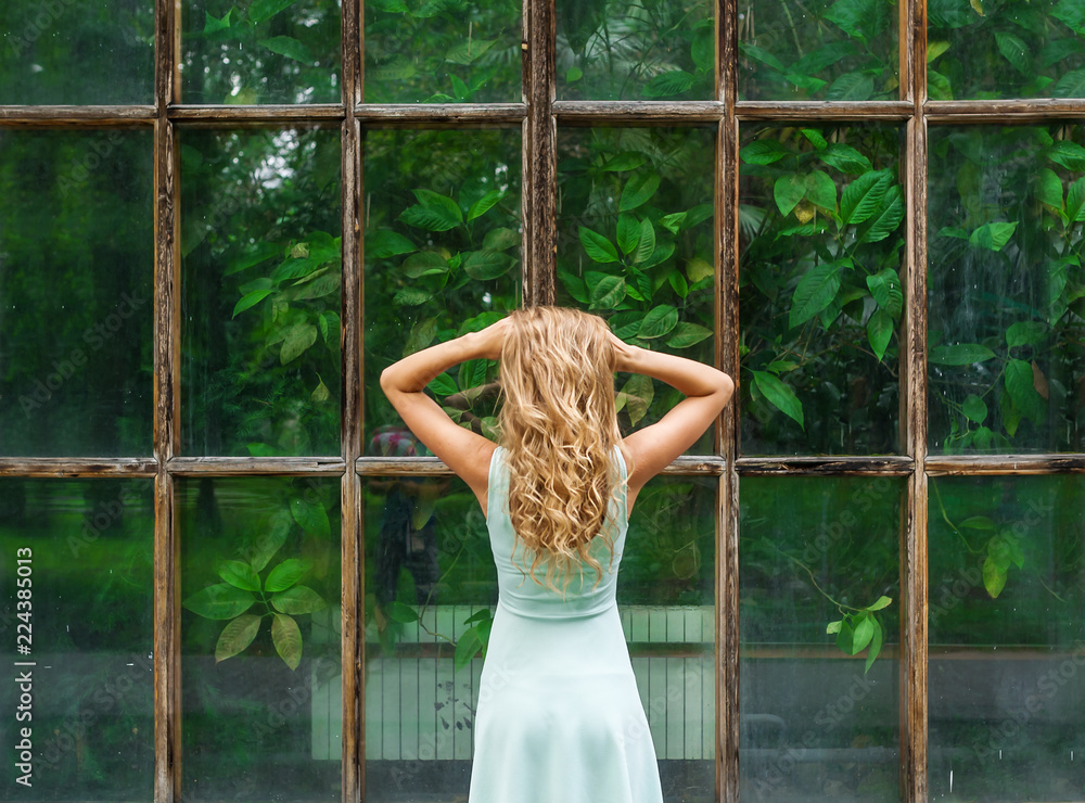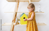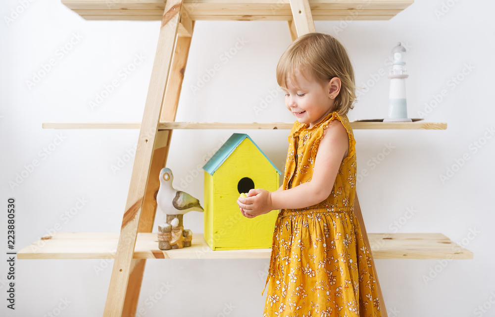 Beautiful little girl with small eggs in hands play in nursery.