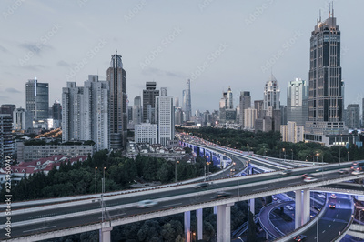 aerial view of buildings and highway interchange at dusk in Shanghai city