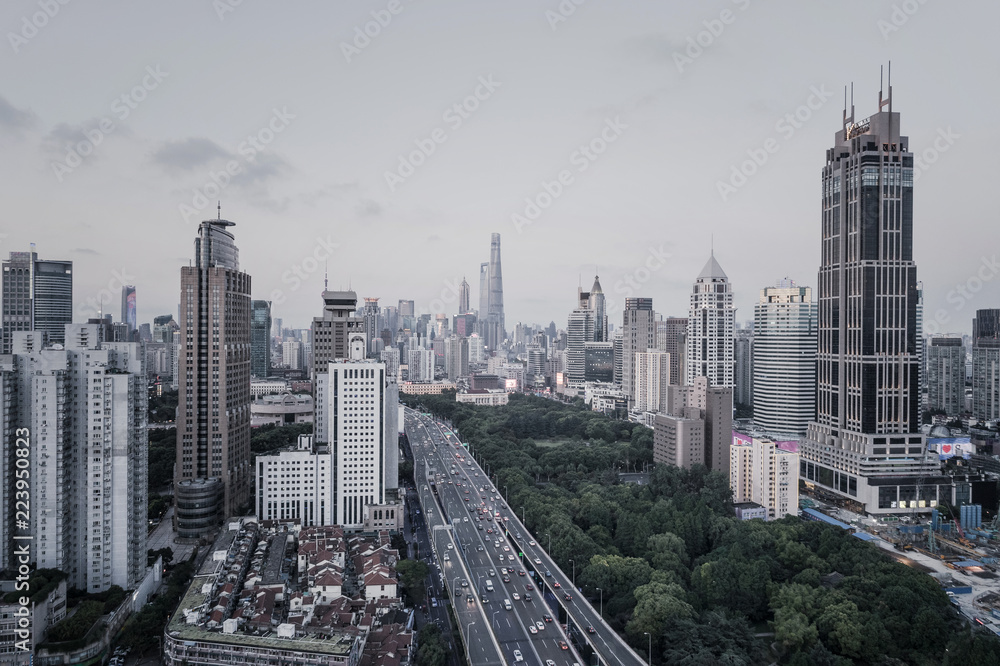 Aerial View of Yanan Rd, Jingan district, Shanghai in the evening