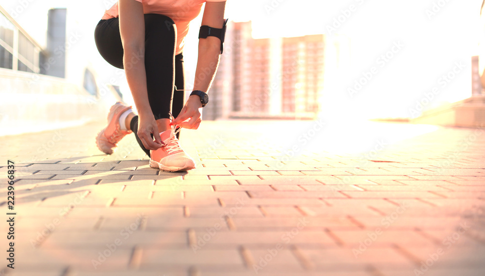 Young fitness attractive sporty girl runner ties up the shoelaces on her sports shoes getting ready to run.
