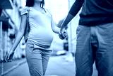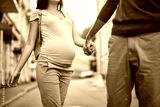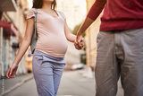 Loving couple. Cropped portrait of gentleman in red sweater leading charming future mother along the street