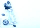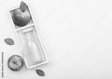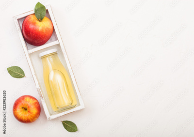 Glass bottle of fresh organic apple juice with pink lady red apples in vintage box on wooden background