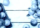 Pink lady royal gala red and granny smith green apples in vintage box on wooden background. Space for text